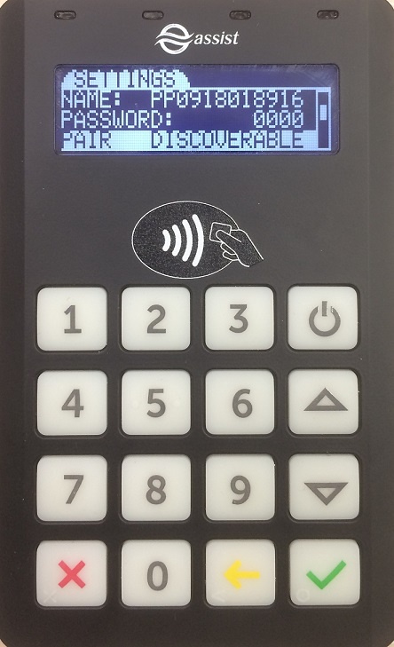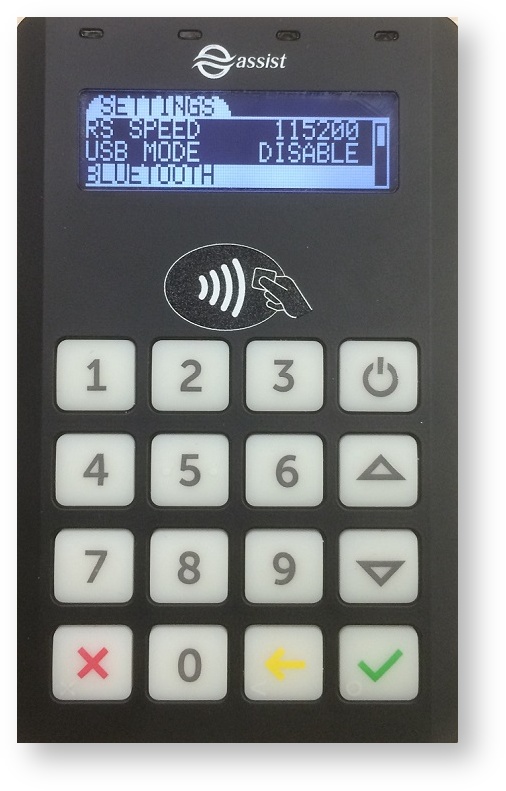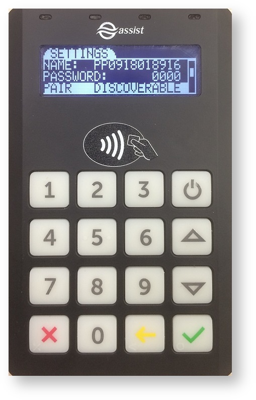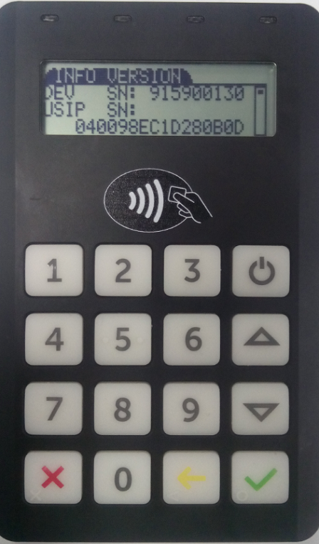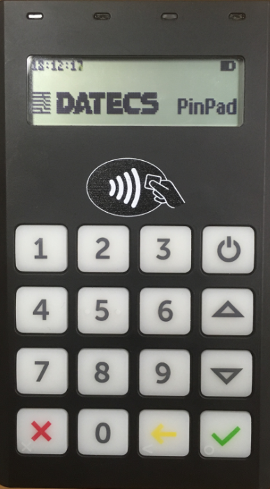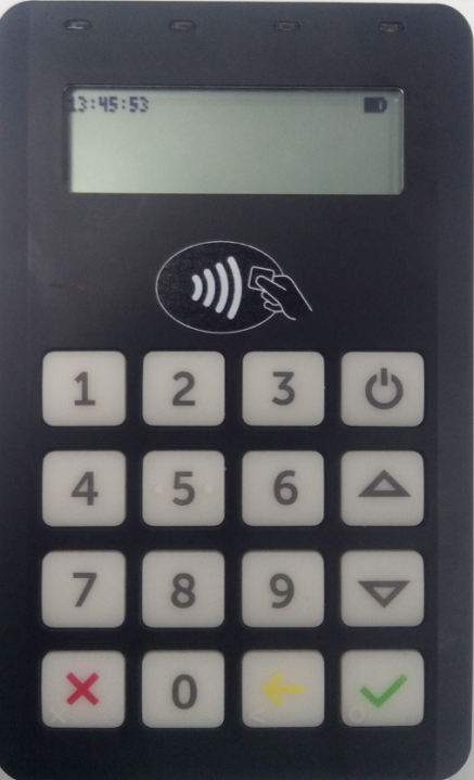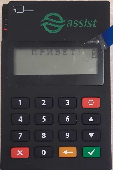 Включение беспроводного терминала осуществляется с помощью нажатия и удерживания кнопки включения, при этом загорается синий светодиод. На экране включенного беспроводного терминала отображается приветствие.