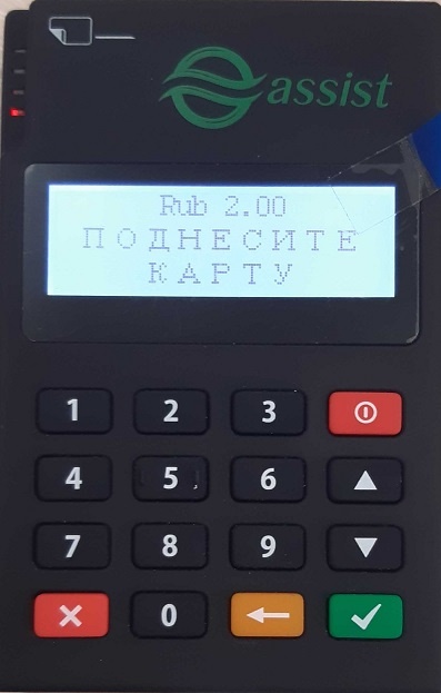 Карту следует прикладывать к обратной стороне терминала в том месте, где находится логотип бесконтактной оплаты.