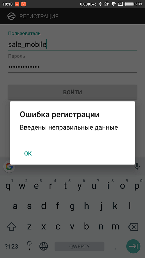 Если регистрация прошла неуспешно (были указаны неверное имя пользователя или неверный пароль), на экране отобразится следующее сообщение.