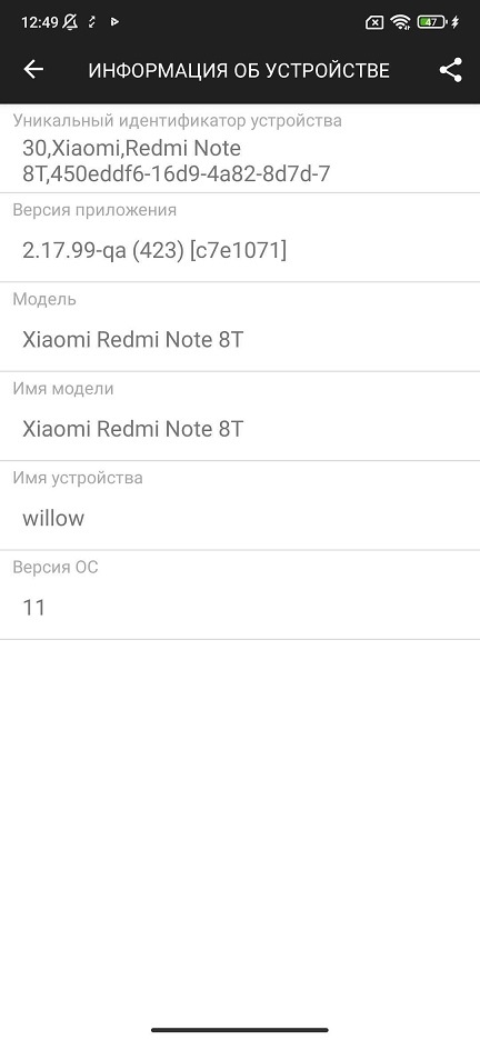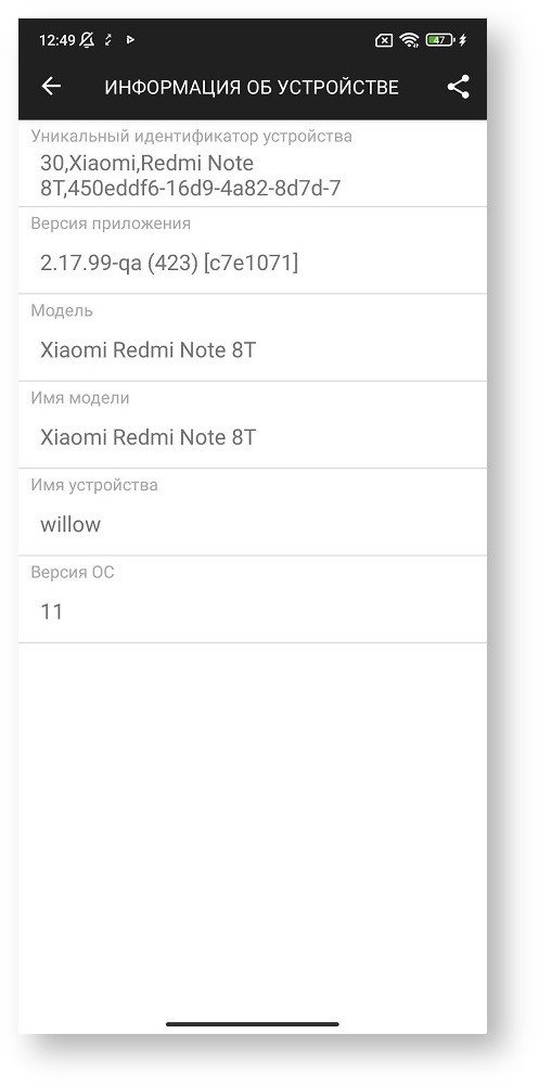 С помощью раздела "Устройство" можно получить сведения о текущих настройках устройства и версии приложения. Этими данными при необходимости (например, при запросе от службы поддержки) можно поделиться с помощью кнопки в верхней правой части экрана.