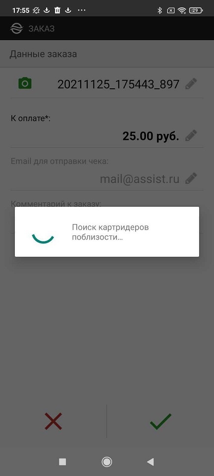 При выборе способа оплаты картой процесс оплаты заказа начинается с организации соединения с беспроводным терминалом.