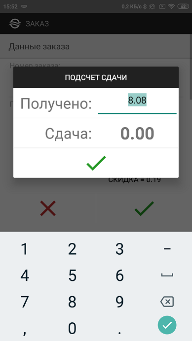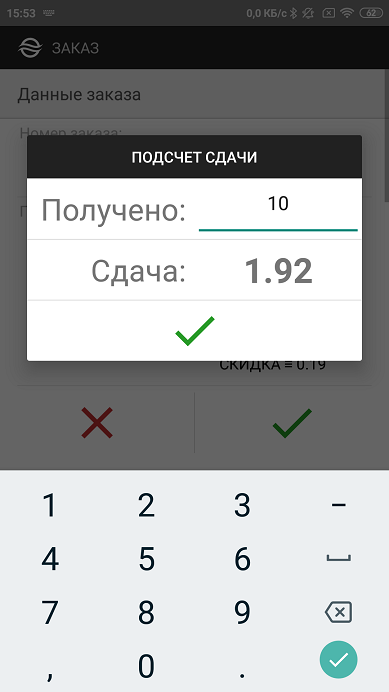 Если в строке суммы заказа ввести значение полученной от покупателя суммы, то в строке сдачи отобразится точное значение сдачи, причитающейся покупателю.