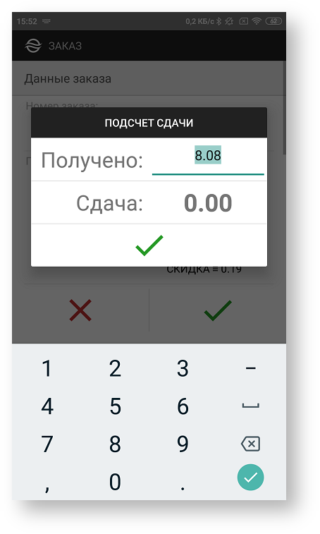 При выборе оплаты наличными для удобства пользователя осуществляется подсчет сдачи.