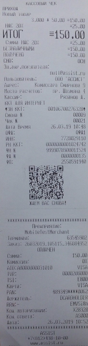 Ниже представлен внешний вид чека, напечатанного фискальным принтером после успешного платежа.