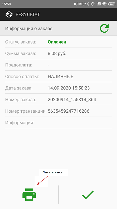 При наличии подключенного принтера можно распечатать чек об оплате. Подключение принтера описано в разделе "Подключение принтера"