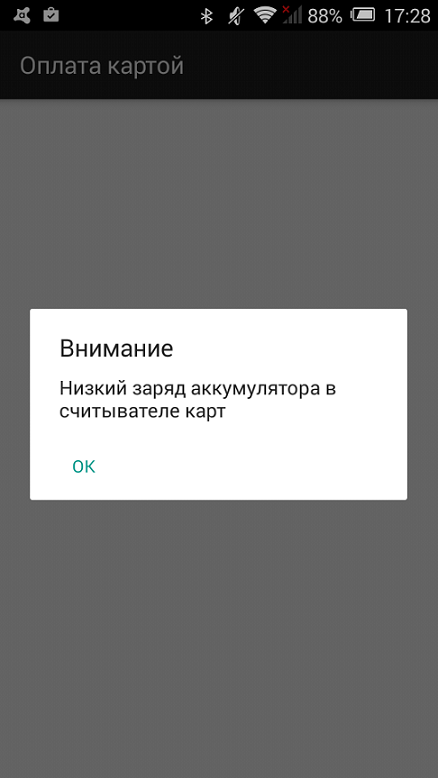 При недостаточном заряде батареи беспроводного терминала в приложении Assist mPOS выводится соответствующее сообщение:
