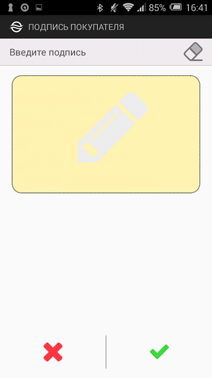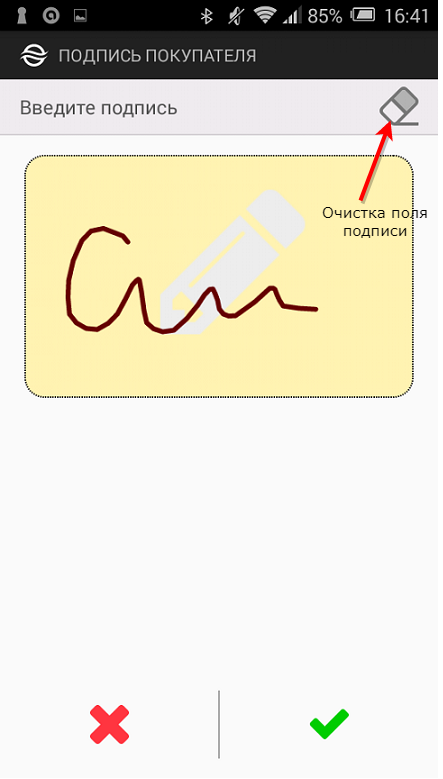 Кнопка в правом верхнем углу экрана позволяет очистить поле подписи и заново выполнить подпись, если первоначальный вариант по каким-то причинам не устраивает покупателя.