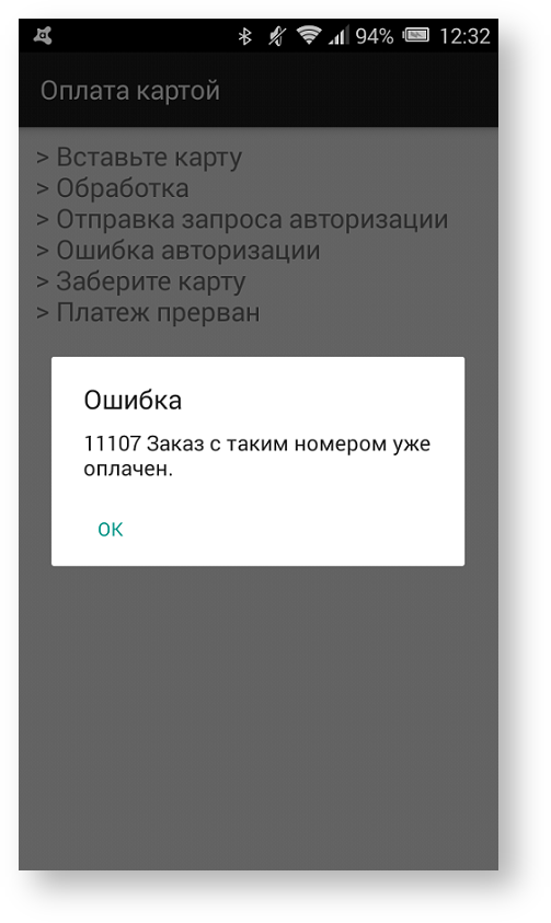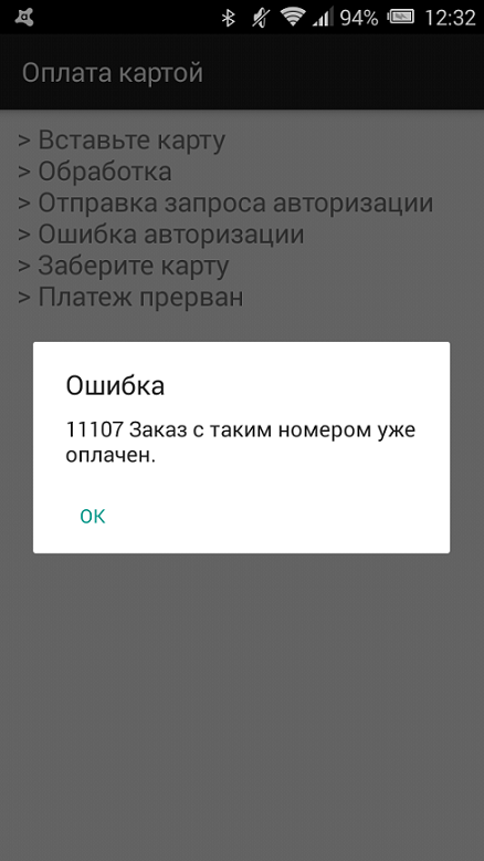 Если выполнена повторная попытка оплаты заказа, то возможно появление следующего сообщения: