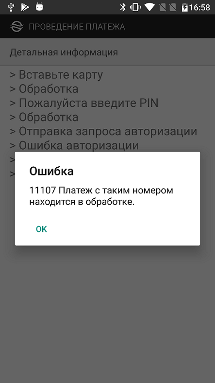 Также вероятна ситуация, когда обработка платежа все еще не завершена. В этом случае при попытке совершить повторный платеж на экране отображается следующее сообщение: