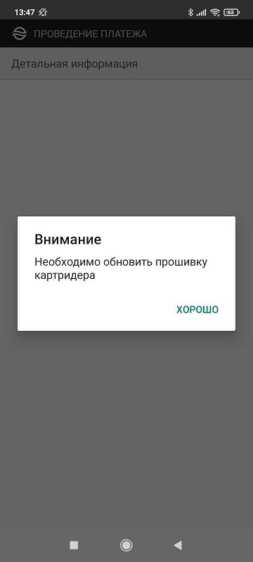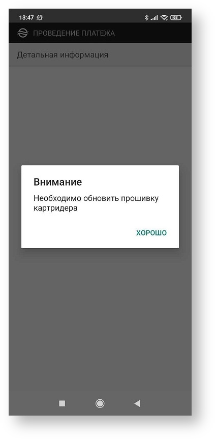 Кнопка «» осуществляет возврат к первому экрану приложения (или в приложение предприятия). С помощью специальной кнопки можно повторить попытку платежа (например, после пополнения карты).