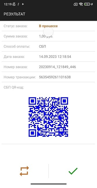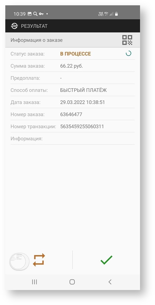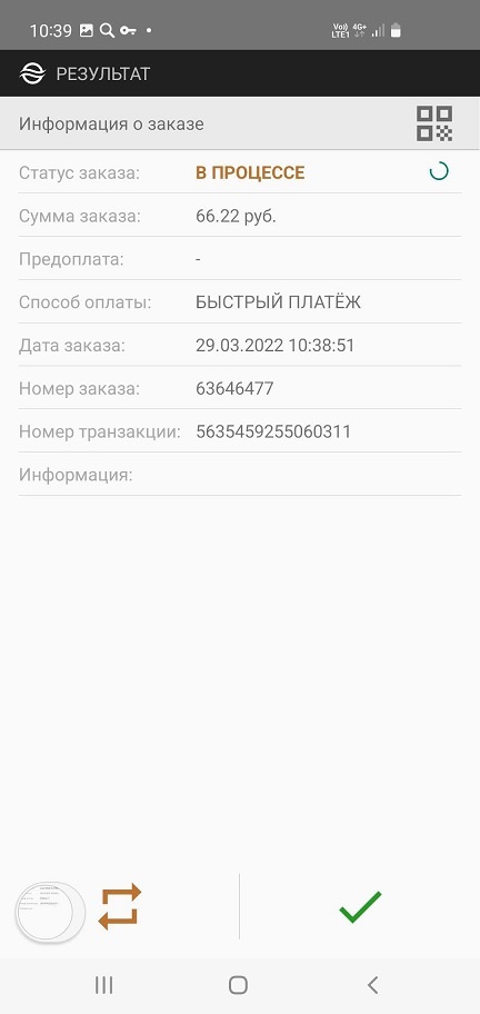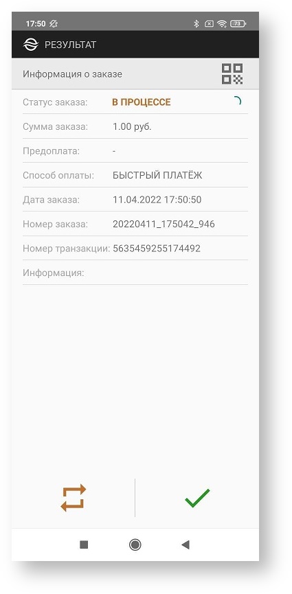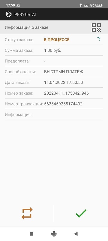 Если проведенный платеж имеет статус «В процессе», то приложение будет автоматически запрашивать результат платежа до его получения, при этом отображается иконка обновления: