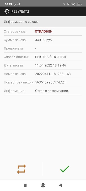 Далее открывается результирующий экран платежа, в котором указана причина неуспешной авторизации: