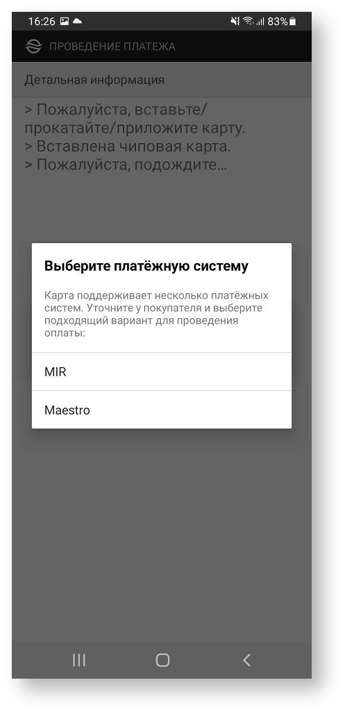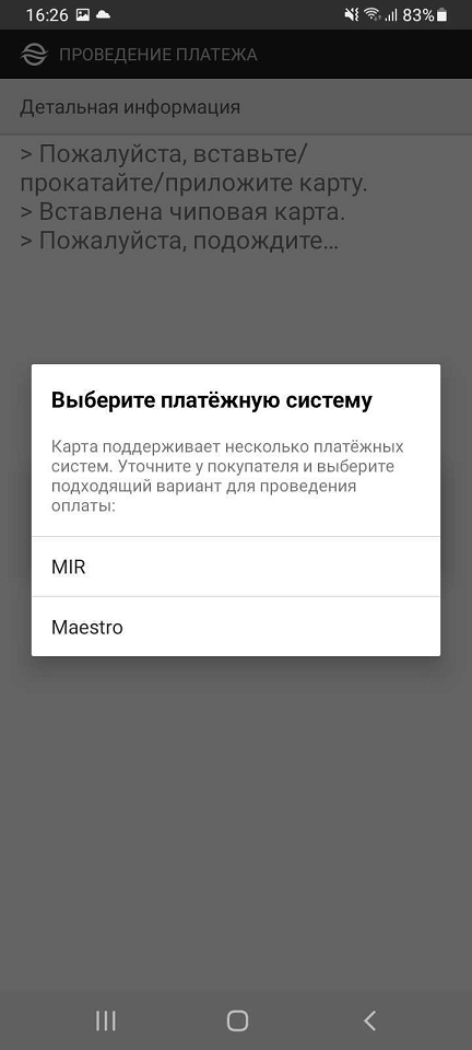 При оплате с помощью чипа и использовании беспроводного терминала qpos на экране приложения будет отображено окно, в котором можно выбрать платежную систему для осуществления платежа.