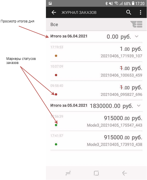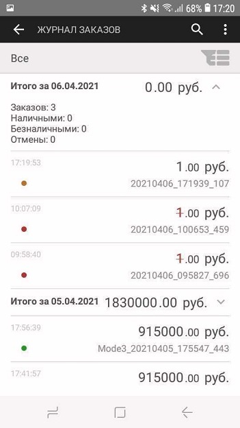 В журнале заказов можно в любой момент просмотреть результат работы приложения mPOS за текущий день. Для просмотра итогов следует нажать на кнопку «Итого за <ДАТА>», после чего отобразится итог за день в виде выпадающего списка значений: