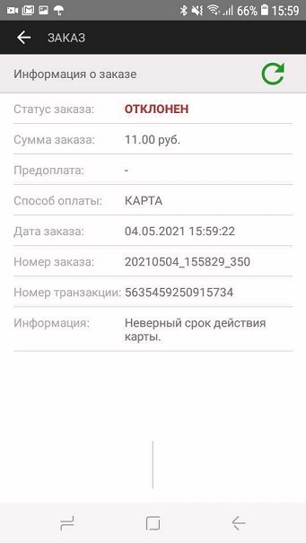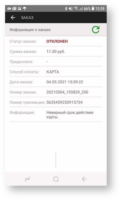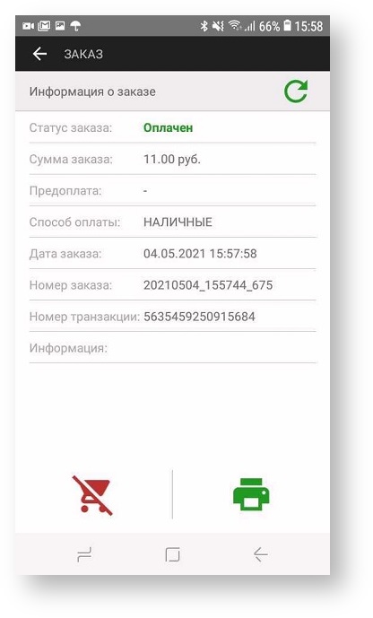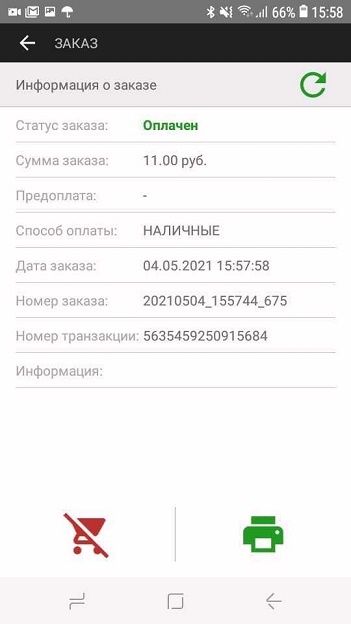 Каждая из представленных в журнале записей может быть просмотрена подробно, здесь же можно обновить статус заказа с неизвестным статусом или находящегося в процессе. Если заказ был оплачен с помощью СБП и находится в процессе, то при его просмотре дополнительно отображается кнопка вызова QR-кода.