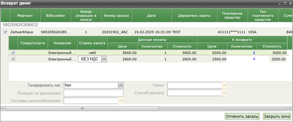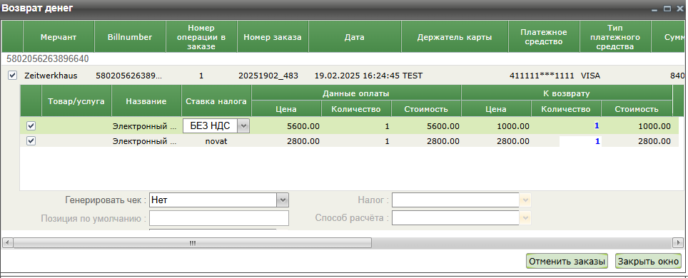 Внимание! При отмене части позиции автоматическая фискализация осуществляться не будет независимо от установленного значения параметра Генерировать чек.