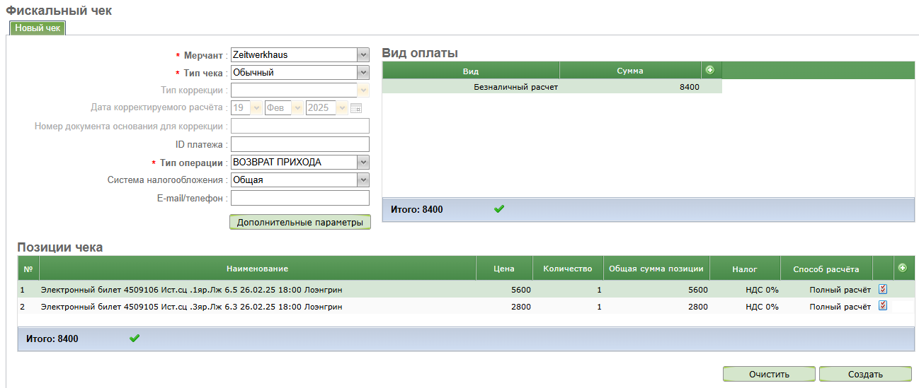 Внимание! Разница сумм этих двух чеков должна точно равняться сумме проведенной отмены 8400-900=7500. Если это не так, то веб-сервис пакетной фискализации вернет ошибку и чеки не будут сформированы.