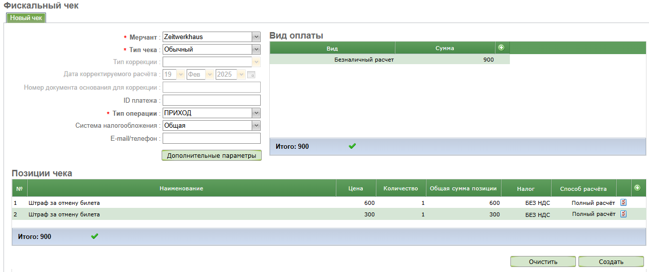 Изображения ниже отражают процесс создания необходимых чеков для того же примера, который был использован при описании реализации отмены со штрафом с помощью использования веб-сервисов.