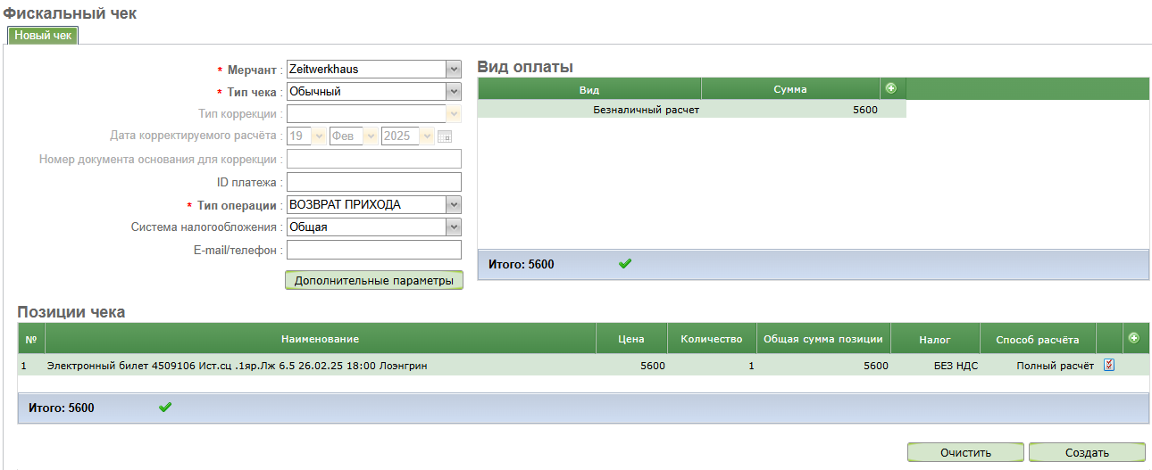 - чек на полный возврат одного билета (одной позиции заказа) на сумму 5600 руб.;