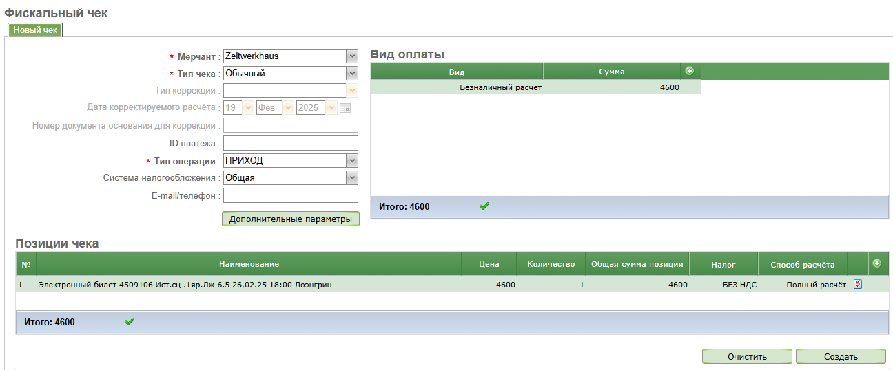 Для получения таких чеков следует воспользоваться разделом Фискальный чек. Здесь можно создать необходимые чеки и отправить их на фискализацию.