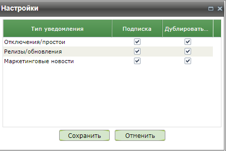 По умолчанию пользователю включены уведомления всех типов с автоматическим дублированием сообщения на адрес электронной почты. Здесь пользователь может настроить получение уведомлений нужного ему типа, а также дублирование уведомлений на Email.