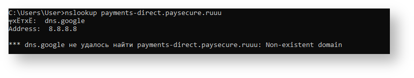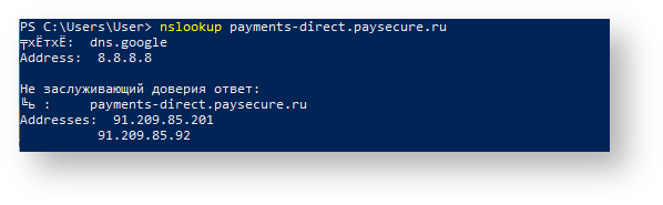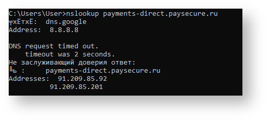 Для диагностики службы DNS, проверки DNS записей сервера payments-direct.paysecure.ru и обнаружения проблем, связанных с разрешением имен в системе DNS используется команда в командной строке (cmd):