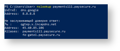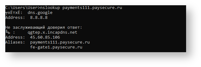 Для диагностики службы DNS, проверки DNS записей сервера payments111.paysecure.ru используется команда в командной строке (cmd):