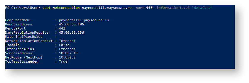 Для проверки доступности 443 порта (HTTPS) сервера payments111.paysecure.ru из сети пользователя применяется команда в Powershell: