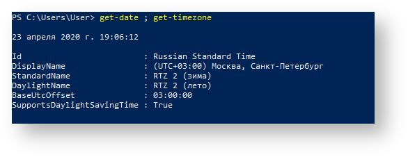 Вывести текущую дату и время, а также часовой пояс в системе можно с помощью команды в Powershell: