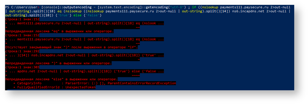 [console]::outputencoding = [system.text.encoding]::getencoding("utf-8") ; if ((nslookup payments111.paysecure.ru 2>out-null | out-string).split()[18] -eq (nslookup ((nslookup payments111.paysecure.ru 2>out-null | out-string).split()[14]) ns6.incapdns.net 2>out-null | out-string).split()[18]) {'true'} else {'false'}