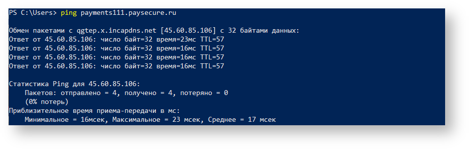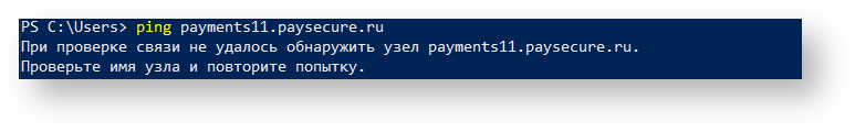 Для проверки целостности и качества соединения с сервером payments111.paysecure.ru используется команда в Powershell: