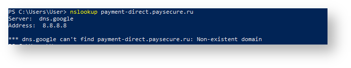 Для диагностики службы DNS, проверки DNS записей сервера payments-direct.paysecure.ru и обнаружения проблем, связанных с разрешением имен в системе DNS используется команда в Powershell: