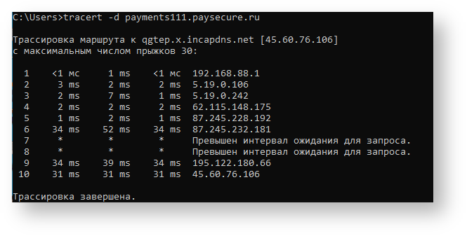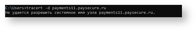 Для определения маршрута, то есть пути прохождения пакетов до сервера payments111.paysecure.ru, используется команда в командной строке (cmd):