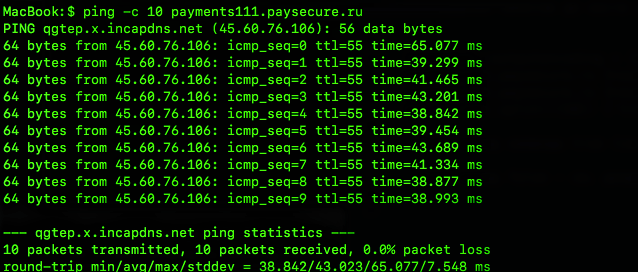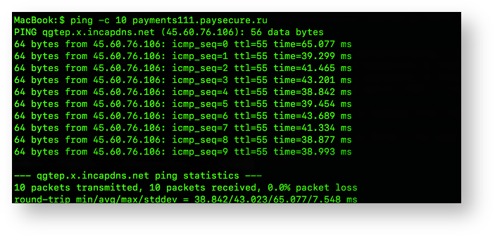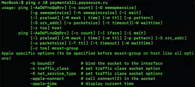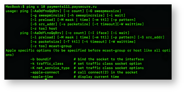 Для проверки целостности и качества соединения с сервером payments111.paysecure.ru используется команда в терминале: