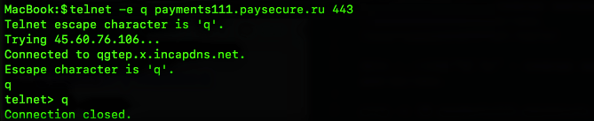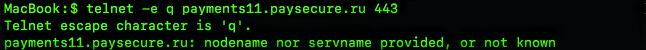 Для проверки доступности 443 порта (HTTPS) сервера payments111.paysecure.ru из сети пользователя применяется команда в терминале: