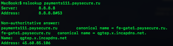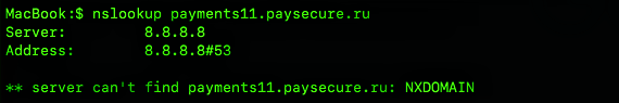 Для диагностики службы DNS, проверки DNS записей сервера payments111.paysecure.ru используется команда в терминале: