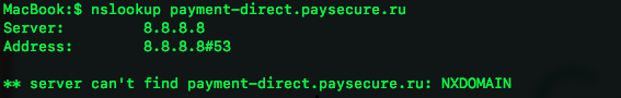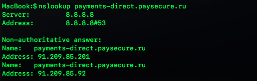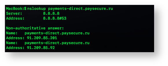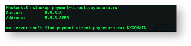 Для диагностики службы DNS, проверки DNS записей сервера payments-direct.paysecure.ru и обнаружения проблем, связанных с разрешением имен в системе DNS используется команда в терминале: