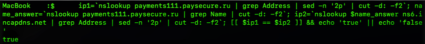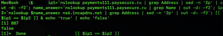 ip1=`nslookup payments111.paysecure.ru | grep Address | sed -n '2p' | cut -d: -f2`; name_answer=`nslookup payments111.paysecure.ru | grep Name | cut -d: -f2`; ip2=`nslookup $name_answer ns6.incapdns.net | grep Address | sed -n '2p' | cut -d: -f2`; [[ $ip1 == $ip2 ]] && echo 'true' || echo 'false'