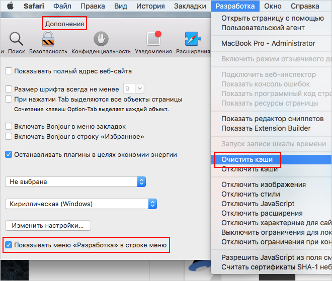 - включить опцию Показывать меню «Разработка» в строке меню;