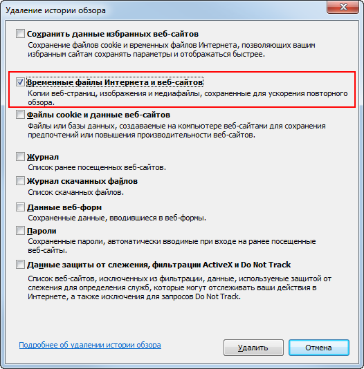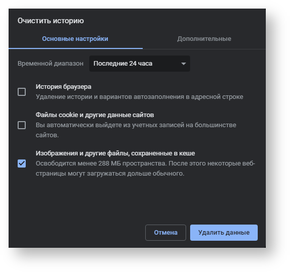 - включить опцию Кэшированные данные и файлы, убедиться, что остальные опции отключены.