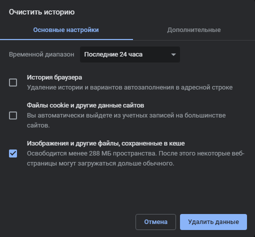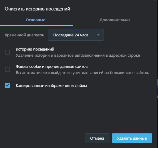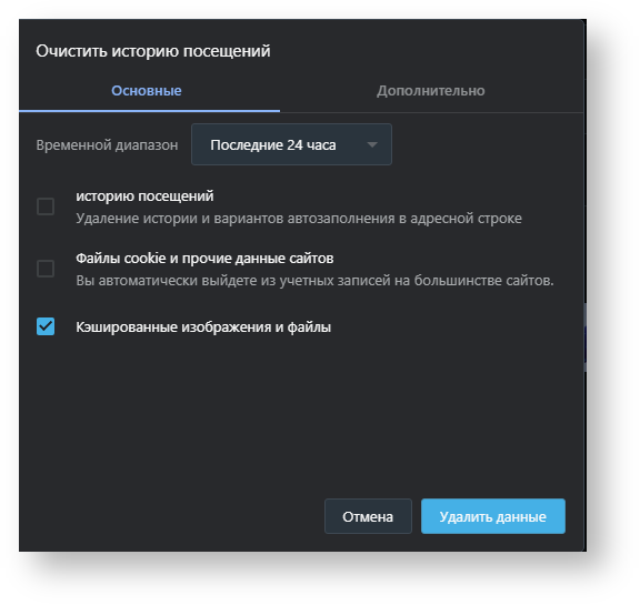 - в окне Очистить историю включить только опцию Изображения и другие файлы, сохраненные в кэше и выбрать из списка временной диапазон Последние 24 часа;