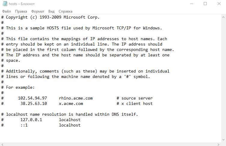 Если файл hosts отличается от примеров, приведенных ниже, то необходимо удалить лишние (отсутствующие в соответствующем используемой ОС примере) строчки, и затем выполнить сброс кэша DNS.