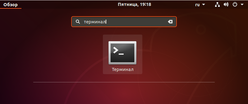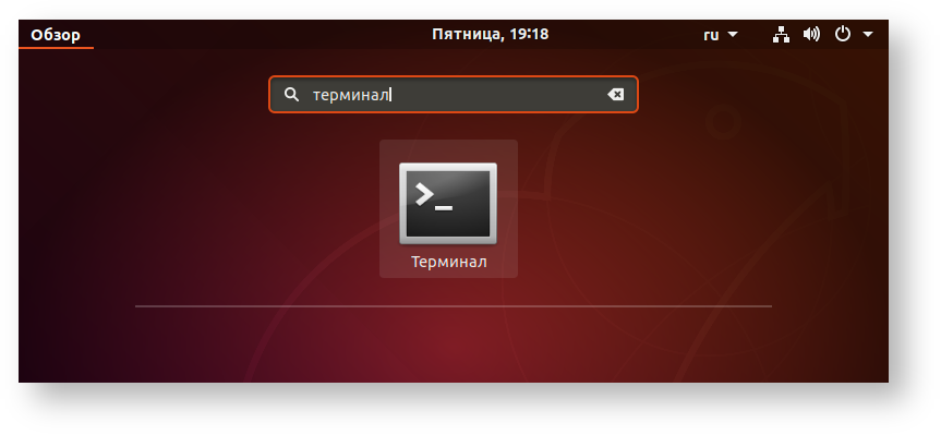 Для запуска терминала необходимо выбрать в меню пункт "Обзор", набрать в окне поиска поиске терминал и дважды кликнуть по иконке терминала.