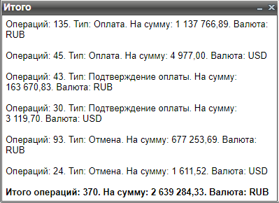 Нажатие кнопки отображает в дополнительном окне итоги по каждой валюте, в которой осуществлялись операции с указанием количества операций в данной валюте, а также общий итог в рублях.