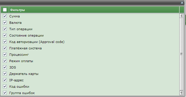 - ID мерчанта(-ов) – выпадающий список c возможностью множественного выбора, содержащий наименования предприятий пользователя. Информация об операциях будет выводиться только по отмеченным галочкой предприятиям.
