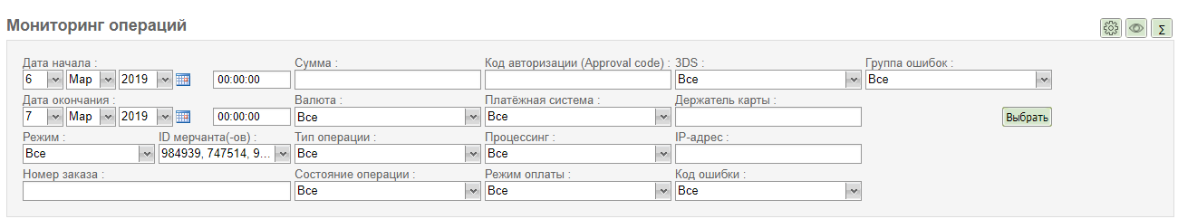 В разделе мониторинга операций доступны для использования фильтры по следующим параметрам: