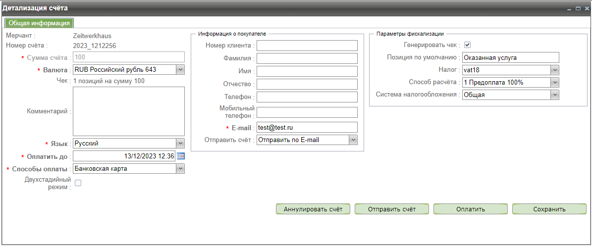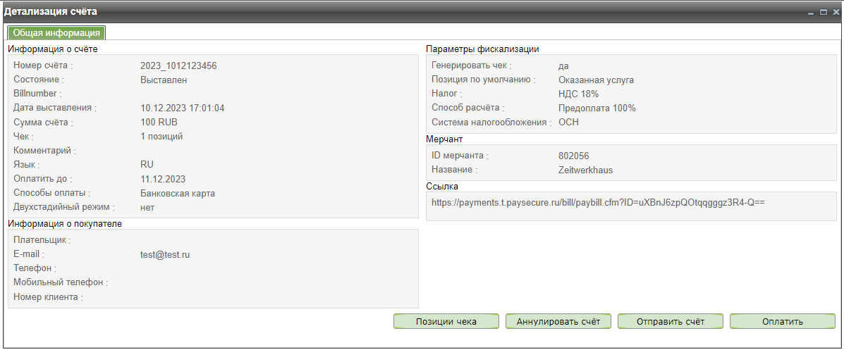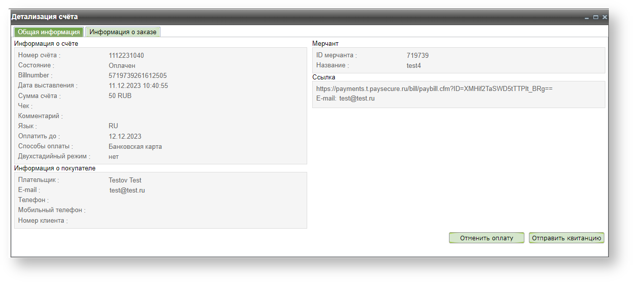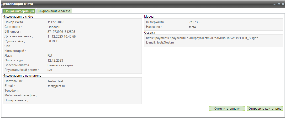 Если счет уже был оплачен и находится в состояниях В оплате, Оплачен, Отменен, Отменен частично, Удален, то окно детализации счета будет иметь две вкладки: «Общая информация» и «Информация о заказе».