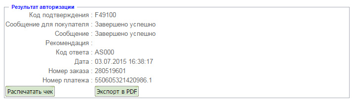 После появления результата авторизации в экранной форме дополнительно появляются кнопки «Распечатать чек» и «Экспорт в PDF»