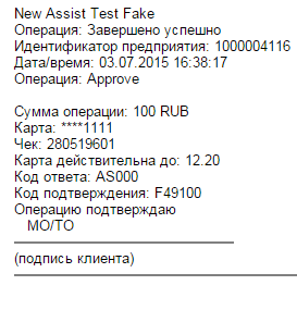 После нажатия кнопки «Оплатить» в нижней части экранной формы отображается результат авторизации со следующими данными: