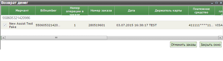 Выбор пункта «Отменить оплату» контекстного меню вызывает открытие нового окна «Возврат денег» с кнопками «Отменить заказы» и «Закрыть окно».